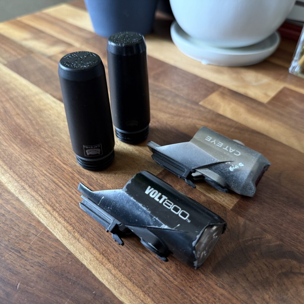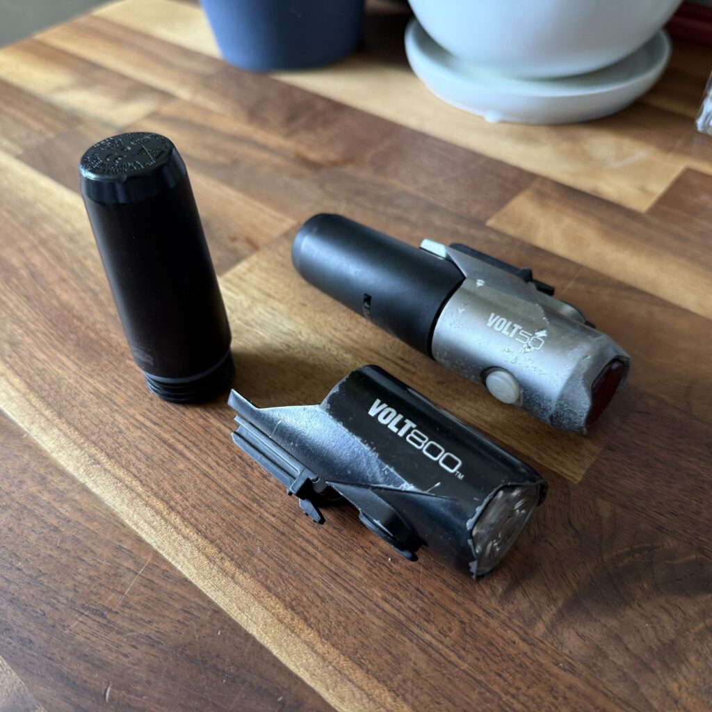 初めて夜道を走ったとき、安価ライトでは前方が心もとないと痛感。以後、配光とバッテリー運用でVoltに落ち着きました。